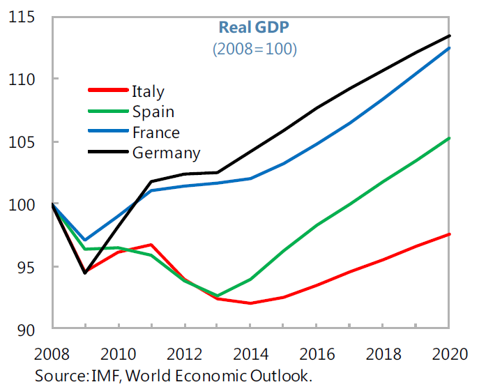 Euro area-wide policies and national efforts have supported a turnaround in market sentiment and real activity. Italy’s performance since the crisis, however, has been among the weakest in the euro area. Real activity and investment are still far from their precrisis levels; unemployment is high; and public debt, at 130 percent of GDP, is a source of risk. Low productivity and impaired balance sheets continue to weigh on the recovery and cloud medium-term growth prospects.