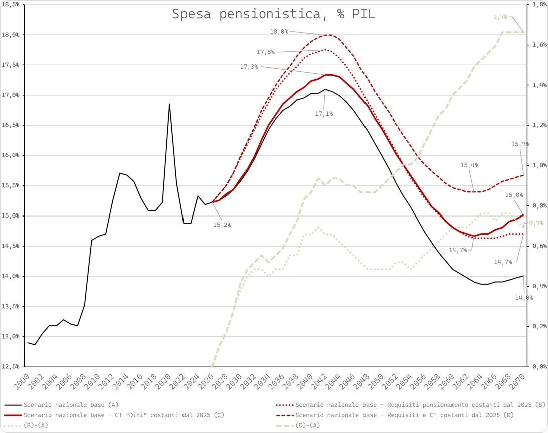 Secondo lo scenario nazionale base di proiezione, l’incidenza sul PIL della spesa pensionistica passa da circa il 15,2 per cento del 2025-2026 a oltre il 17 per cento del 2042-2043, per poi ridursi gradualmente e scendere sotto il 14 per cento nel 2062-2063, e quindi riacquistare una leggera tendenza al rialzo negli anni successivi. Solo tra il 2050 e il 2055 lo scenario base vede l’incidenza della spesa sul PIL ritornare allo stesso livello di oggi.