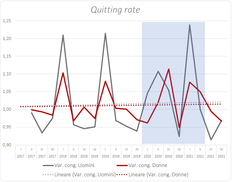 Per adesso, l'unica evidenza che si può sostenere, almeno per il caso italiano, è di una "fiammata" del quitting-rate tra il IV trim. 2022 e il II trim. 2021 (emerge anche dai dati dell'"Osservatorio sul precariato" dell'INPS), che si è innestata su una evoluzione del fenomeno che già seguiva un trend crescente da alcuni anni.
