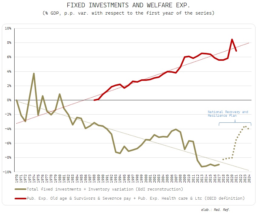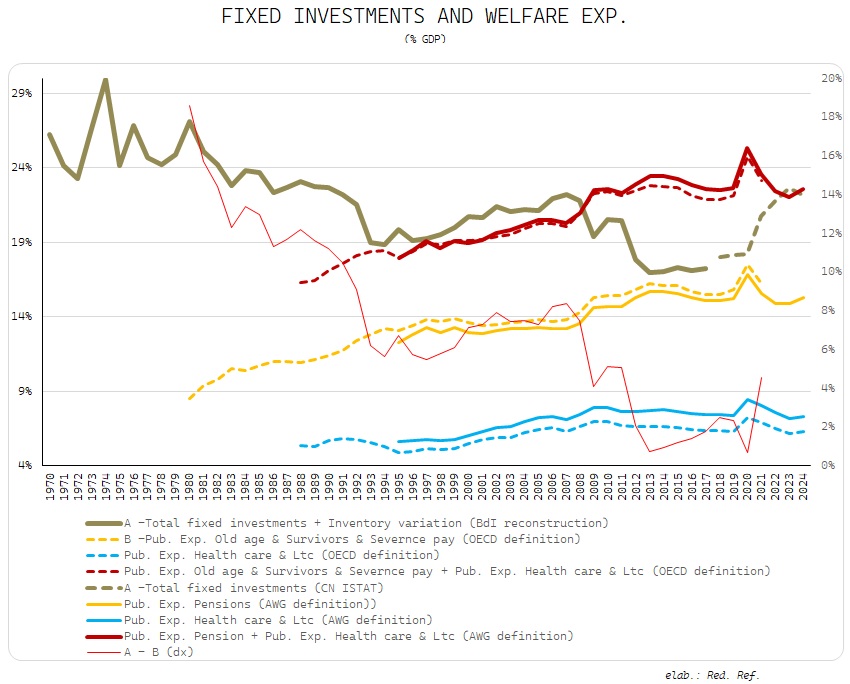 È un altro modo di mettere in luce il divario generazionale perché, in sintesi e volutamente semplificando, gli investimenti preparano la società e l’economia del futuro e mettono a disposizione capitale produttivo per gli attivi e i più giovani, mentre la più parte delle spese in pensioni e sanità si rivolge ai 65+ e va a loro beneficio. È amaro ma logico constatare che, se non si investe (strumenti, strutture, tecnologie, R&S, etc.) e non si rinnova l’economia, anche la capacità di finanziare in futuro pensioni e sanità viene indebolita.