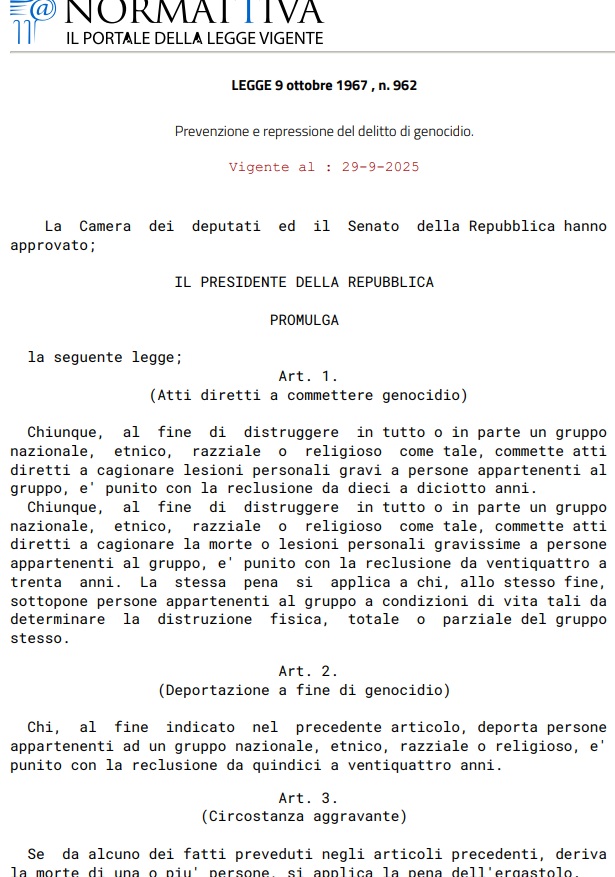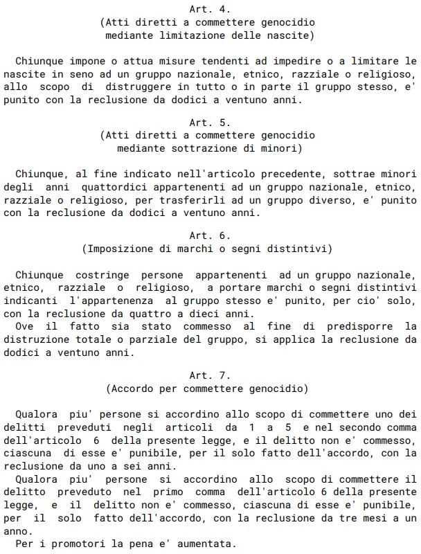 << Chiunque, al fine di distruggere in tutto o in parte un gruppo nazionale, etnico, razziale o religioso come tale, commette atti diretti a cagionare lesioni personali gravi a persone appartenenti al gruppo, è punito con la reclusione da dieci a diciotto anni. Chiunque, al fine di distruggere in tutto o in parte un gruppo nazionale, etnico, razziale o religioso come tale, commette atti diretti a cagionare la morte o lesioni personali gravissime a persone appartenenti al gruppo, è punito con la reclusione da ventiquattro a trenta anni. La stessa pena si applica a chi, allo stesso fine, sottopone persone appartenenti al gruppo a condizioni di vita tali da determinare la distruzione fisica, totale o parziale del gruppo stesso. >> [art. 1]